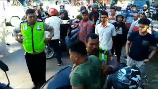 Seorang polisi lalu lintas di Makassar, Sulsel dari Polsek Biringkanaya, Aiptu Sabarno berkelahi dengan seorang pria berbadan kekar berkaus hijau ...